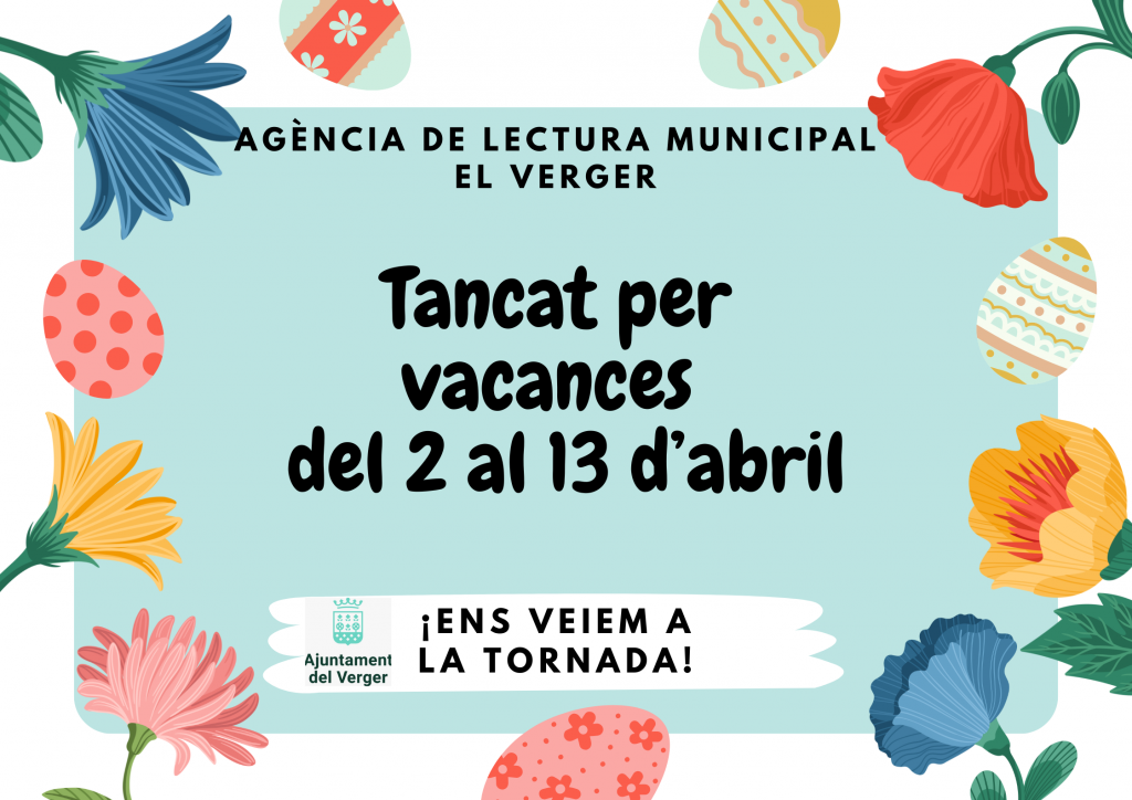 Des de la Regidoria de Cultura es comunica que l’Agència de lectura municipal permaneixerà tancada per vacances del 2 al 13 d’abril. Disculpeu les molèsties.