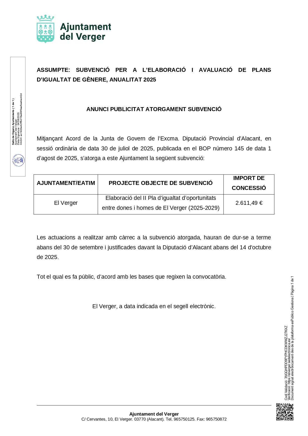 Atorgament Subvenció per a l’Elaboració i Avaluació de Plans d’Igualtat de Gènere
