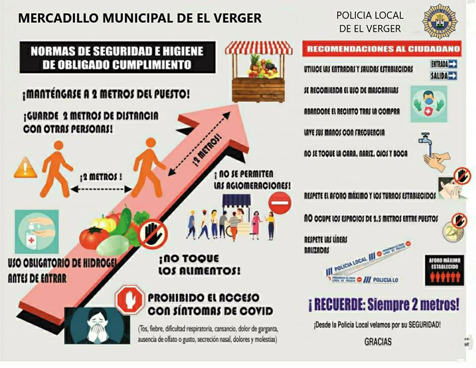 En els accessos es va a situar un dispensador d’hidrogel d’ús obligatori abans d’accedir a l’espai de compra, quedant prohibit tocar els aliments o productes pels clients, que exclusivament podien ser manipulats pels venedors, i les persones en espera han de guardar una distància de 2 metres. A més, la Policia Local del Verger recorda que totes les persones que presenten símptomes compatibles amb el COVID-19 han de guardar quarantena en casa.